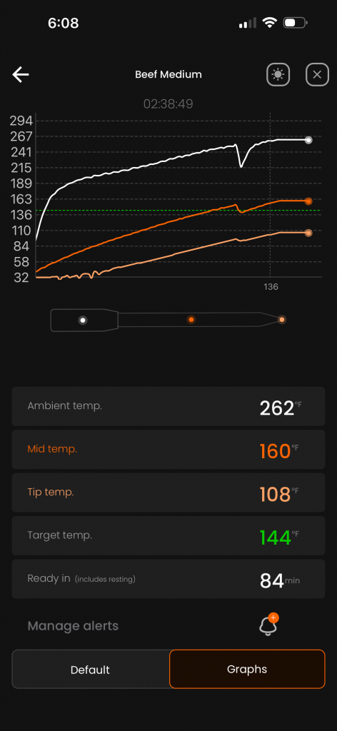 I personally use this Bluetooth meat thermometer because it makes checking the roast accurate and straightforward. I always check the center of the roast with my Bluetooth thermometer, which uses an app to show ambient, middle, and tip temps. (We tested this thermometer by putting it in the roast shortly after taking it out of the fridge and then put it in the oven to see how it would track temps. This was for testing only. Normally you should let the meat get to room temperature first before putting it in the oven.)