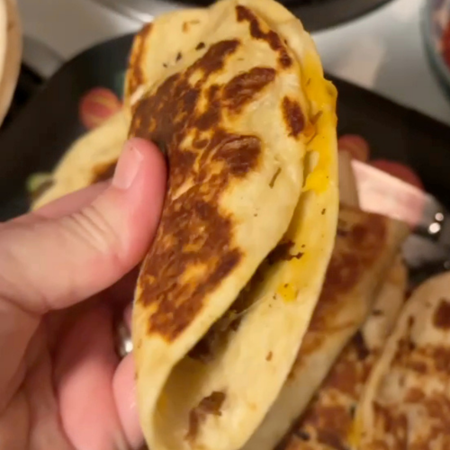 Heat a non-stick or cast-iron skillet. Place some shredded beef and cheese inside a tortilla, fold it over, and sear on both sides until golden and crispy. Repeat until all tacos are done.
