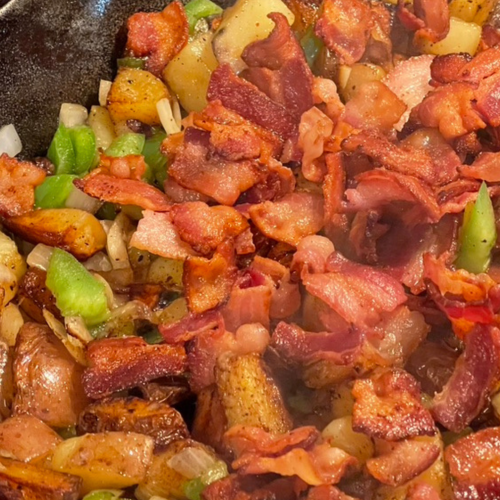 Sauté the veggies. Add diced potatoes, green bell pepper, and onion to the same skillet. Cook for 8–10 minutes, stirring occasionally, until golden and tender. Season with salt and pepper.